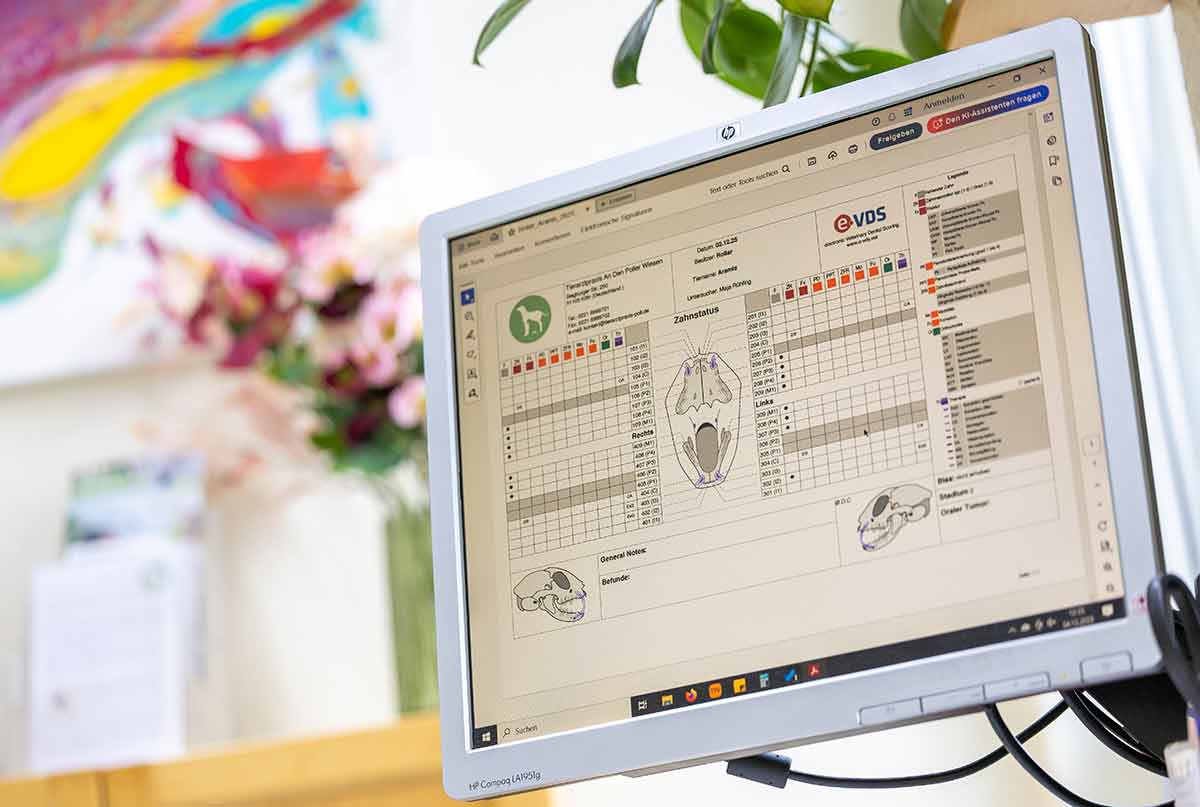 Alle erhobenen Befunde werden sorgfältig dokumentiert. In einem Protokoll erfassen wir alles, was in der Maulhöhle festgestellt wurde. Dadurch haben wir einen umfassenden Überblick über den Zustand der Zähne und des Zahnfleisches.